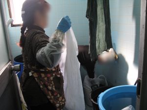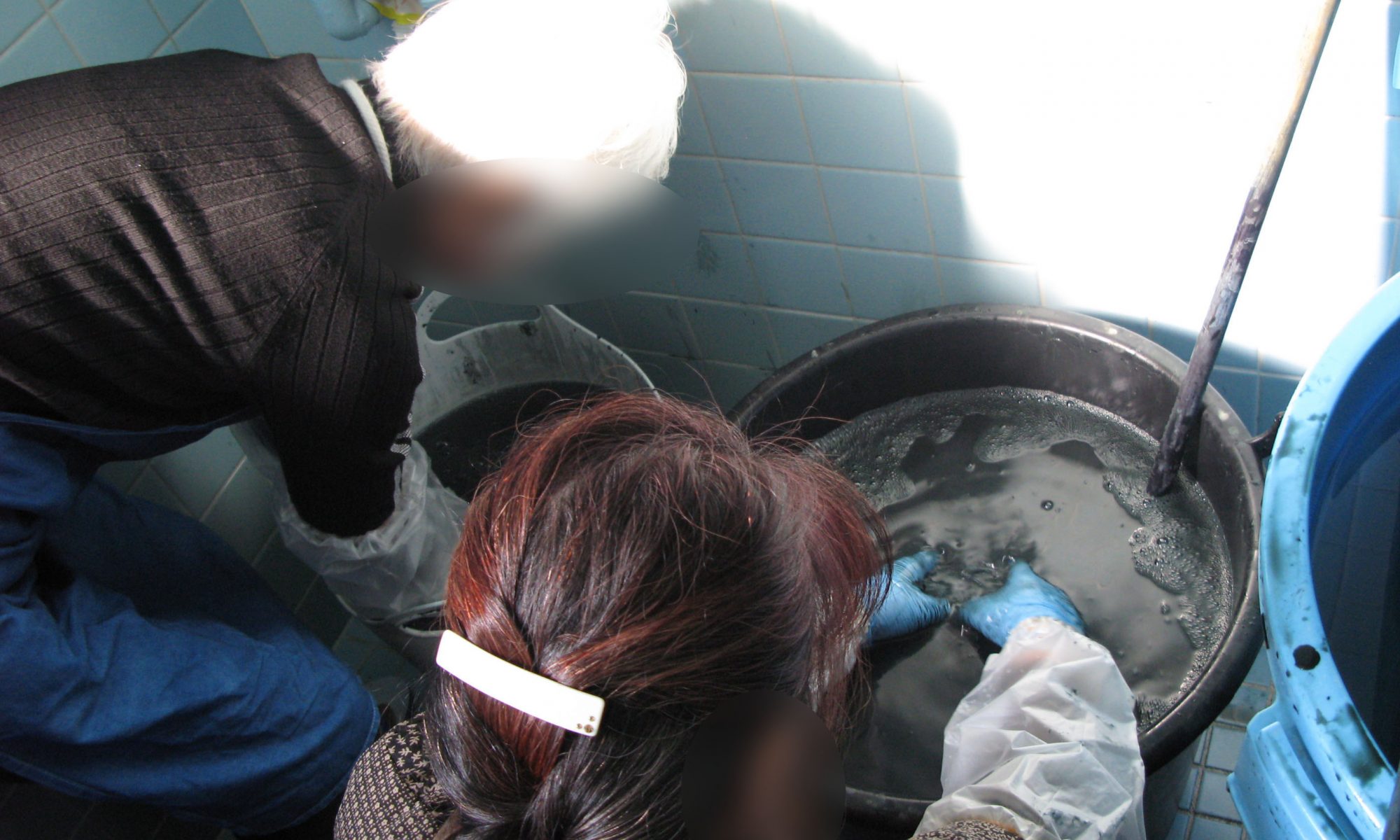 二つの容器に移し、消石灰も塊を除き泥藍を沈殿させるために重労働なので手伝っていただきました。