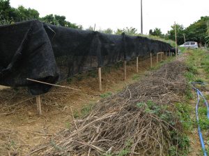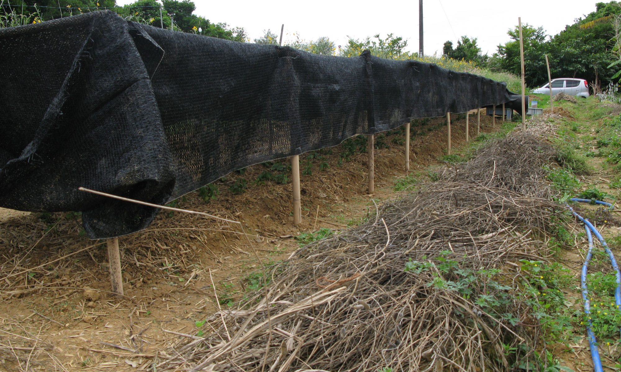 脇の枯れ草の所は、洋綿と和綿とうつまみです。沖縄での和綿の芽出しは結構難しい。