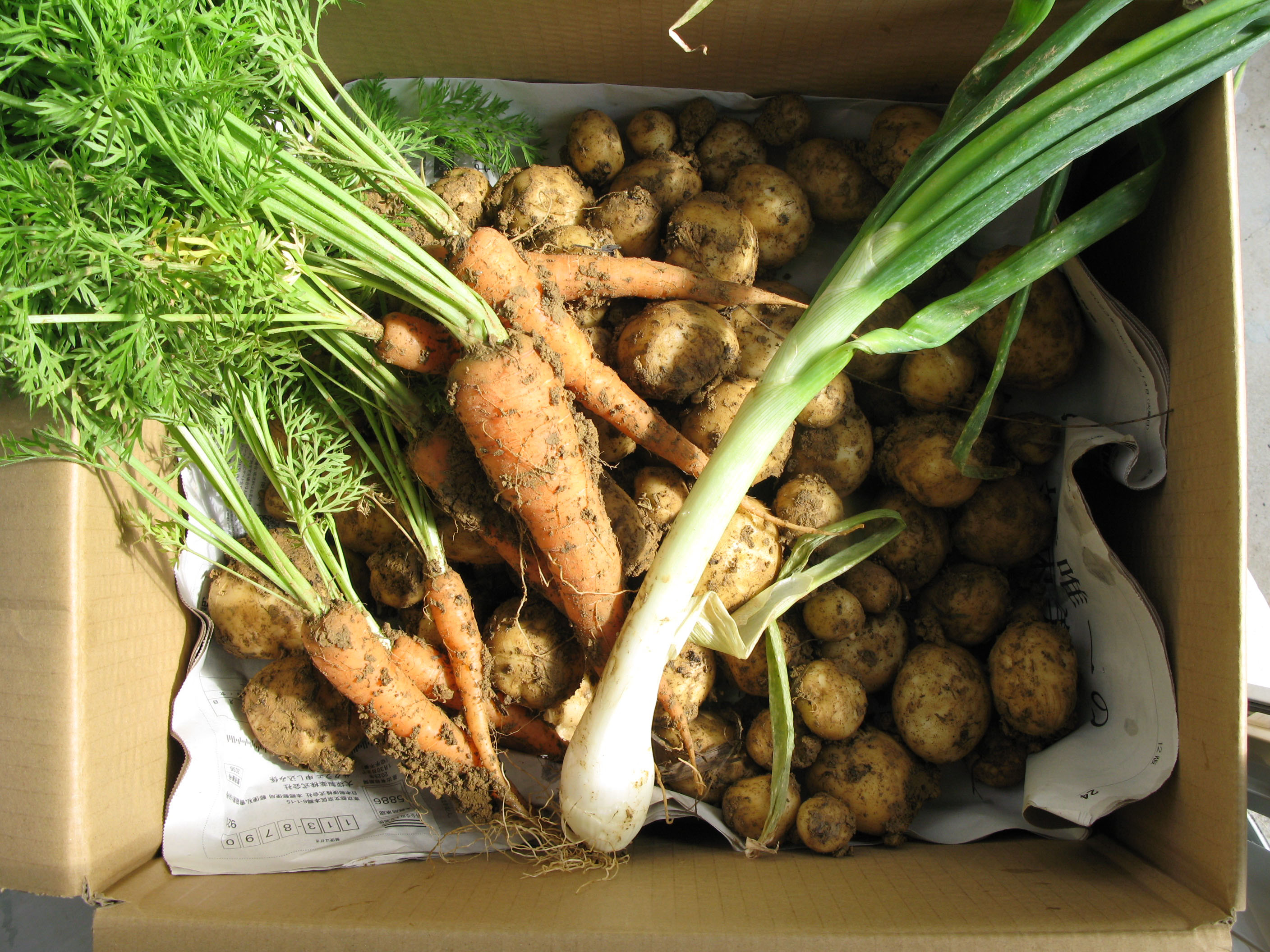 収穫したにんじんとじゃがいも