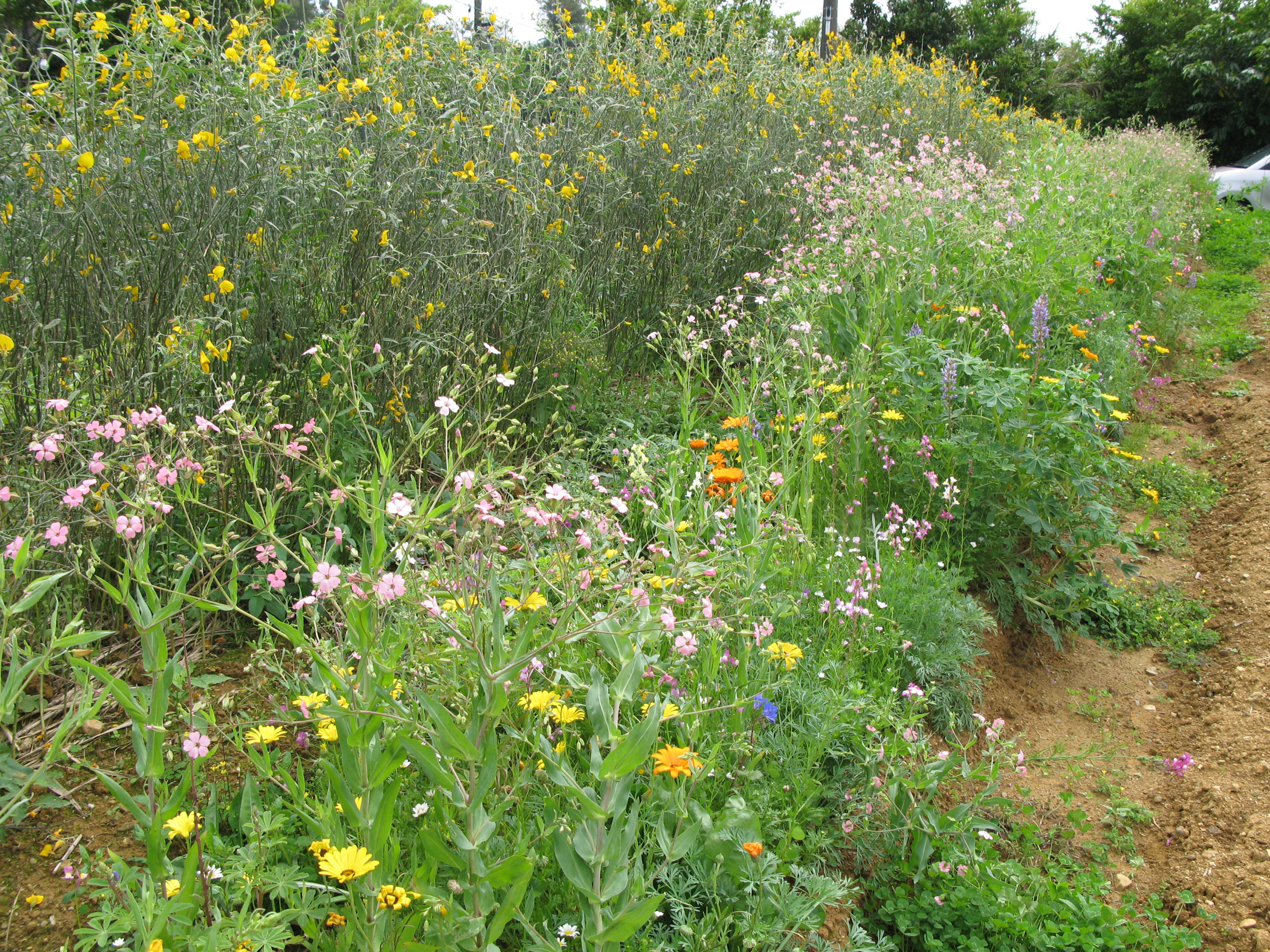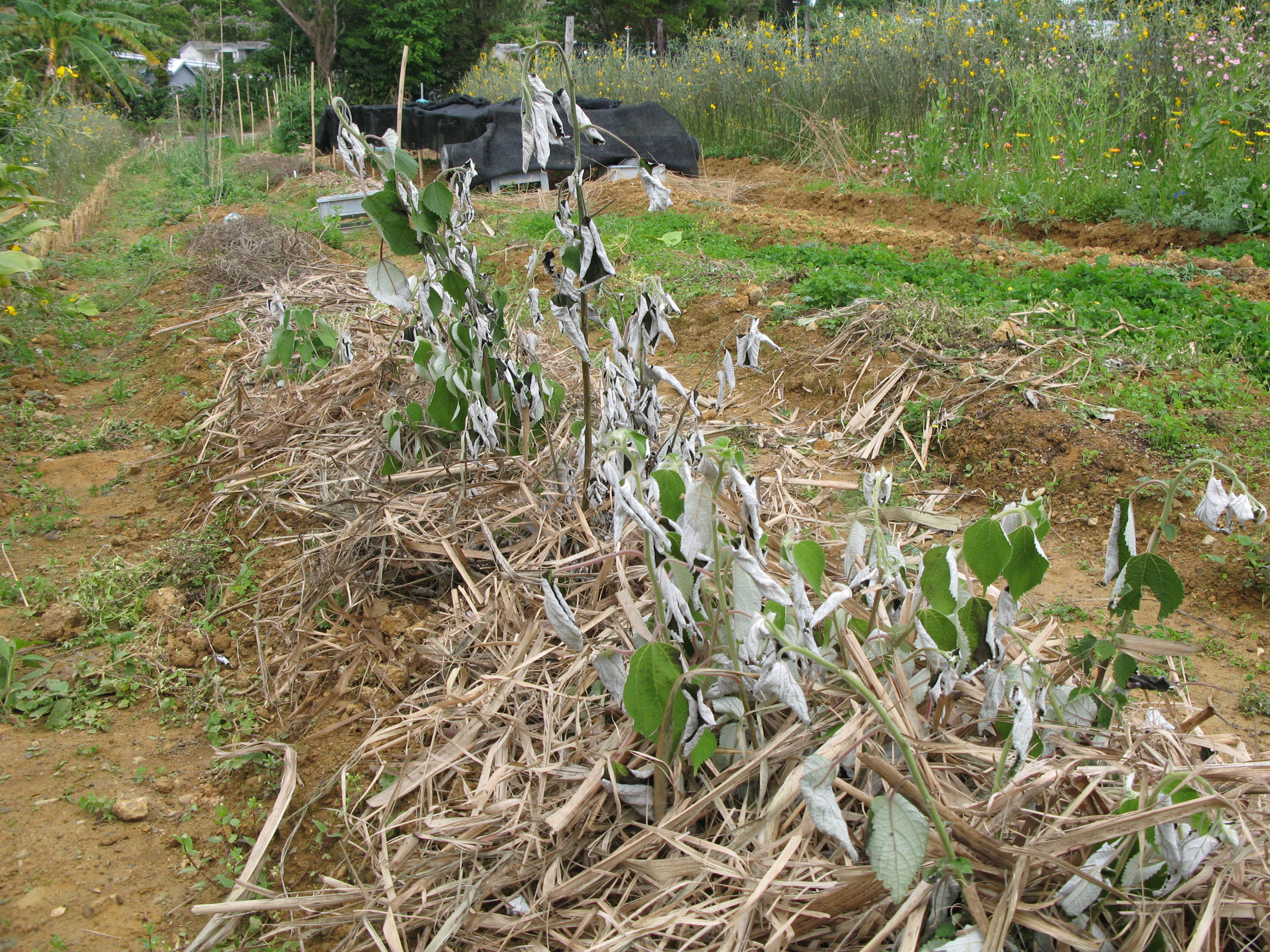 脇の枯れ草の所は、洋綿と和綿とうつまみです。沖縄での和綿の芽出しは結構難しい。